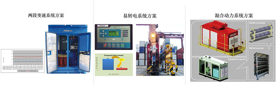 Powertec為自港口碼頭提供全面的電力解決方案,根據自港口碼頭對發電機組需求特點,提供龍門吊靜音型發電機組、兩段變速系統、易轉電系統、混合動力系統等。