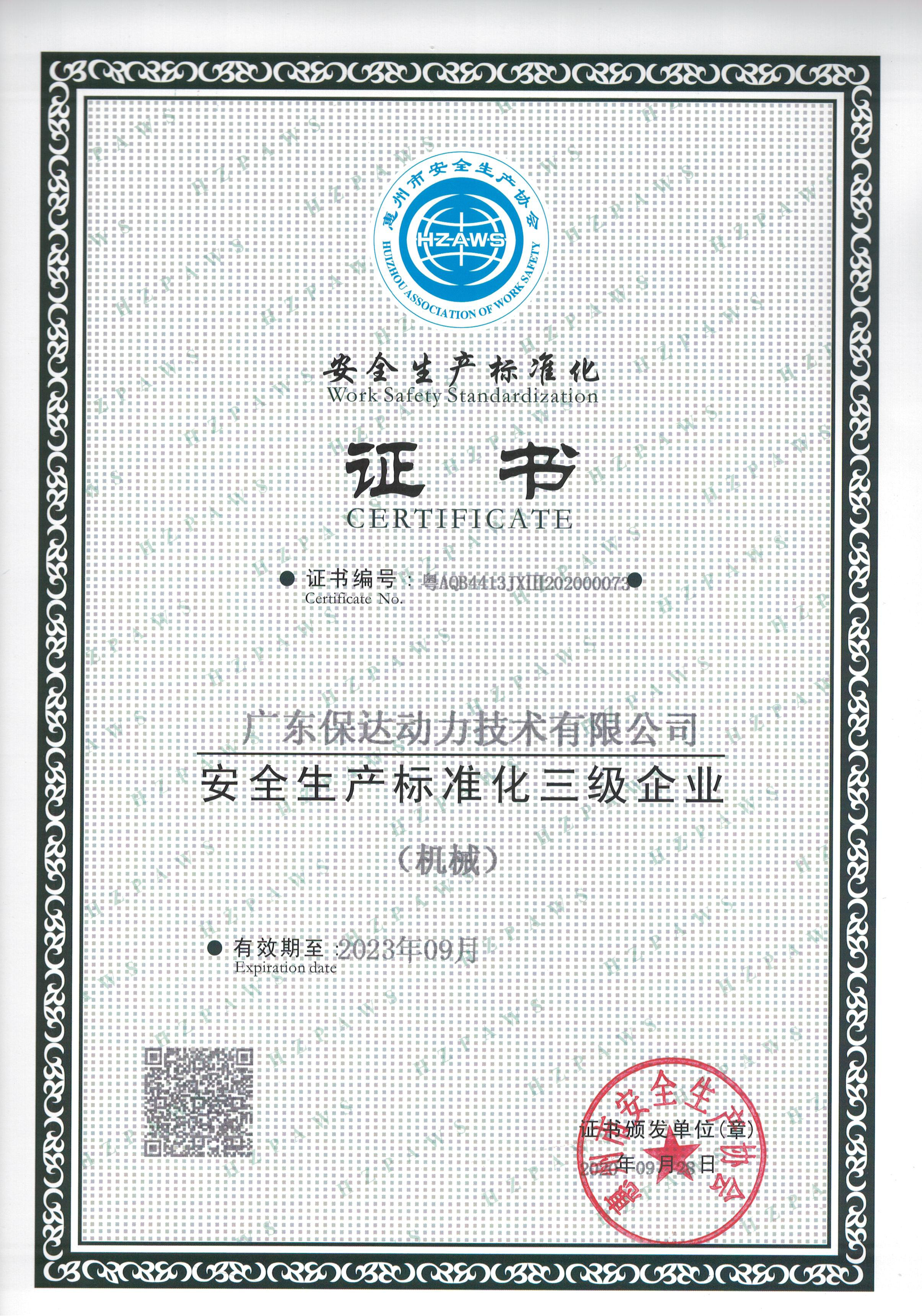 Safety Production Standardization Certificate